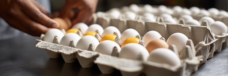 Hands skillfully pack fresh eggs into a carton, organizing them in neat rows while the kitchen buzzes with activity and natural light filters in.