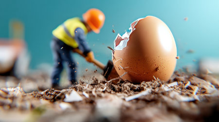 A group of small figurines dressed in hard hats are working on a large egg that has been cracked open