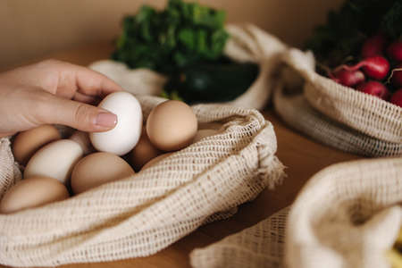 Female hand take egg from canvas grocery bag. Vegetables in reusable eco cotton bags on wooden table. Zero waste shopping concept. Plastic free items