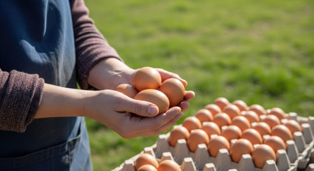 Farmer's hands gently holding a nest of fresh eggs, emphasizing the care and attention in poultry farming.
