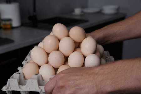 male hands hold a tray filled to the top with chicken eggs