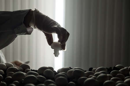 All ready for distribution. Shot of an unrecognisable farmer inspecting the quality of eggs on his farm.