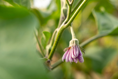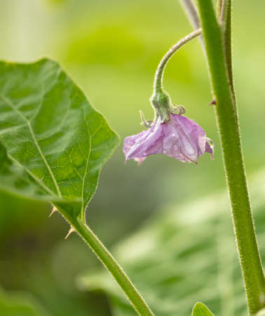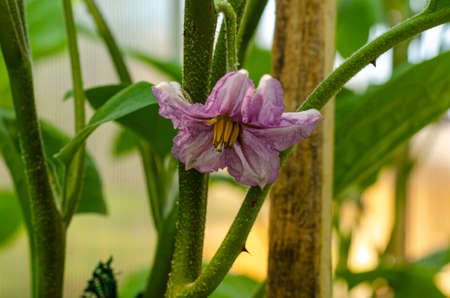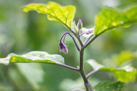Eggplant flower blooms in the garden, eggplant flower stalk hangs on its bush