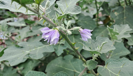 Thai Eggplant Flowers Growing on Plant in Organic Garden