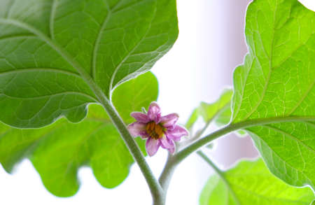 Home garden, eggplant bloom, growing eggplant in flower pot, vegetable garden on windowsill. urban gardening concept
