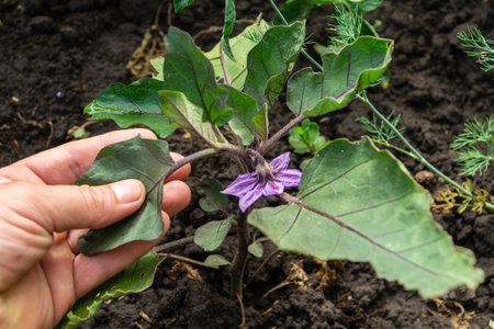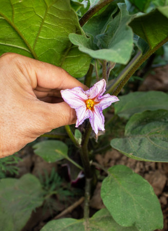 A gardener inspects an eggplant plant, gently holding a branch with a vibrant purple flower. The surrounding soil is rich and dark, indicating a well-maintained garden during warm summer months.