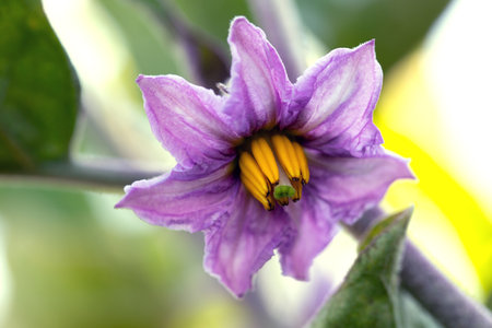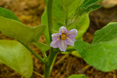 Light purple eggplant flower with yellow core surrounded by two leaves on stem on blurred natural green background. Eggplant bloomed in the garden. Botanical photo or postcard