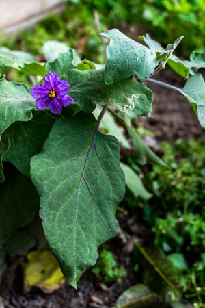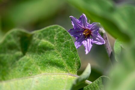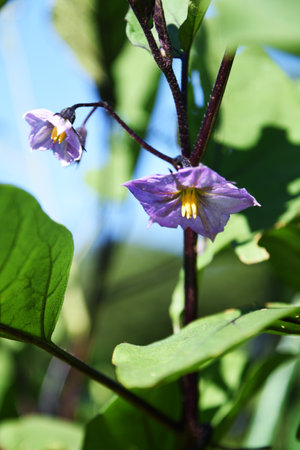Eggplant flowers in the kitchen garden. Solanaceae vegetables.