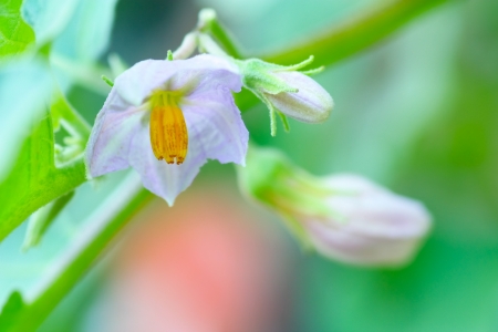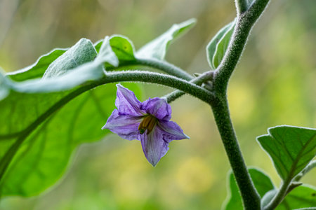 eggplant flowers blooming in nature with beautiful green bokeh background