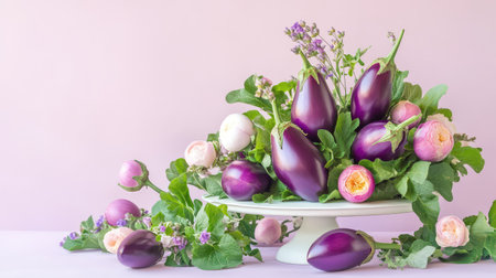 A stunning and vibrant arrangement featuring fresh eggplants and beautiful flowers on a soft pink background, perfect for culinary presentations and creative photography.