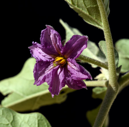 Blooming purple flowers eggplant on bush. Studio Photo.