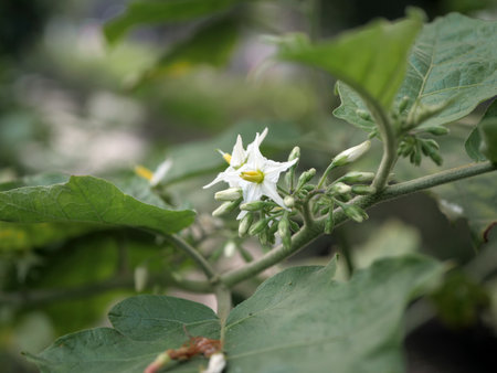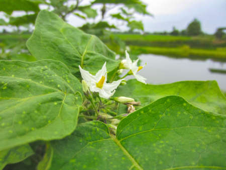 White eggplant flowers with yellow pollen and green background in the middle, this is the agriculture land.