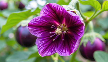 A vibrant purple eggplant blossom with intricate petal patterns, surrounded by lush green leaves and fruit. beautiful representation of nature