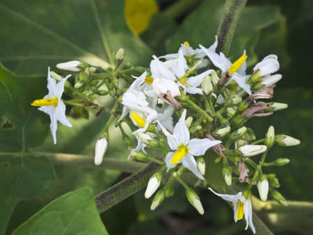 Leaves and white flowers of Thai eggplant in the garden.