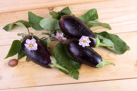 Fresh Purple Eggplant with Leaves on Wooden Surface, Food Still Life