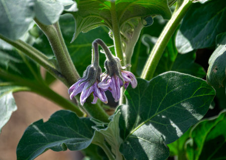 Beautiful purple eggplant flowers blooming in the garden bed.