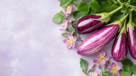 A stunning and vibrant arrangement featuring fresh eggplants and beautiful flowers on a soft pink background, perfect for culinary presentations and creative photography.
