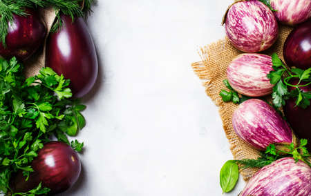 Fresh delicious white and purple eggplants with purple basil on concrete background. Top view.
