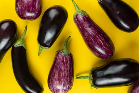 Purple and black eggplants on a yellow background. Fresh vegetables. Top view.