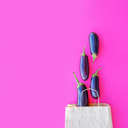 Whole, ripe eggplants are in a paper bag on a purple background. Autumn vegetable concept, harvesting. Flat lay. Top view. Copy space.
