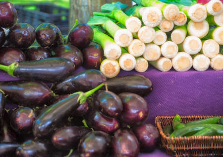 Farmers Market produce stand of leek,eggplant and zucchini.
