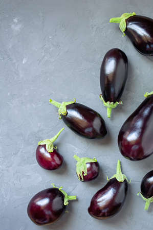 Ripe eggplants of different sizes on a gray concrete background. View from above.