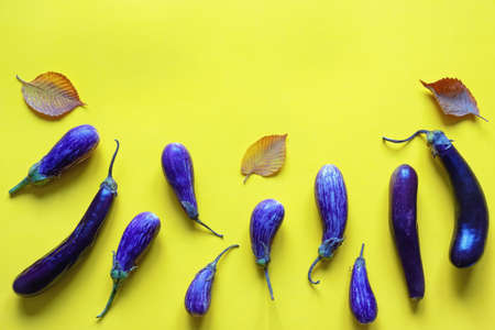 Purple eggplants and autumn leaves on yellow paper, background. Flat lay, copy space