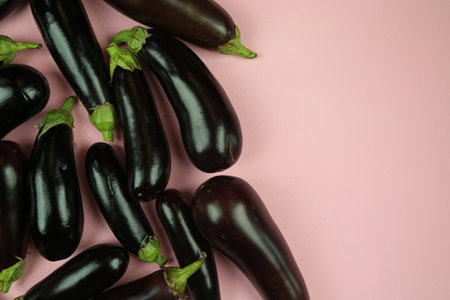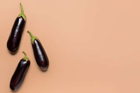 Fresh raw eggplants on a dark background. Top view.