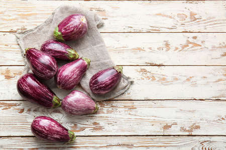 Fresh eggplants on wooden background