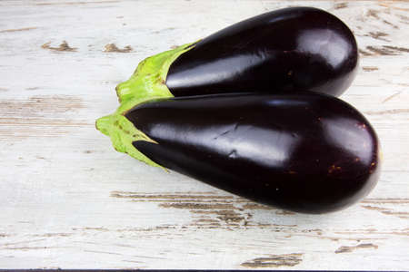 Two fresh eggplants on wooden,light background. Horizontal,flat top view.