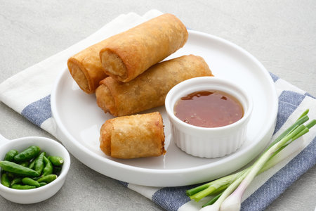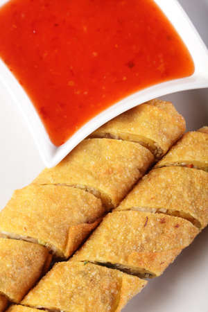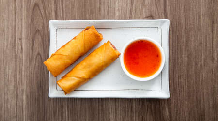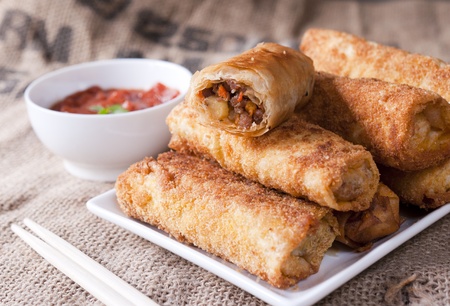 Fried chinese spring rolls with sweet chili sauce on background