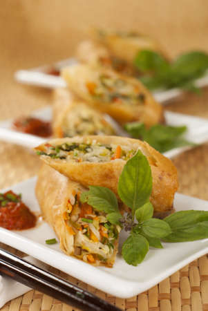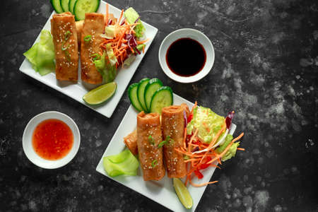 Fresh prepared asian crispy spring rolls with meat and vegetables. Traditional thai cuisine made of fresh ingredients.