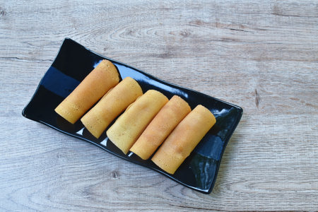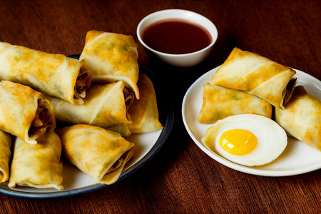Crispy Chinese fried egg roll on wooden table