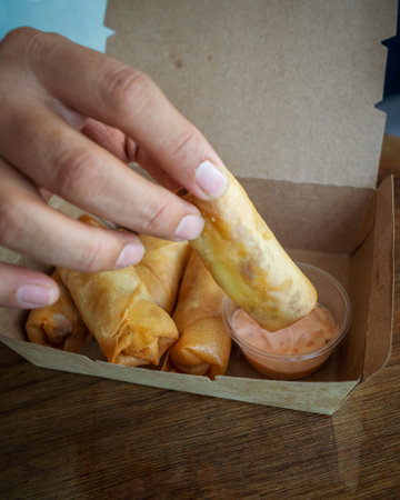 Deep fried spring rolls with sauce at a local Vietnamese street food restaurant. Authentic Vietnamese street food, Vietnamese cuisine