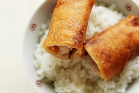 Chinese food, spring roll in half for dumpling on rice