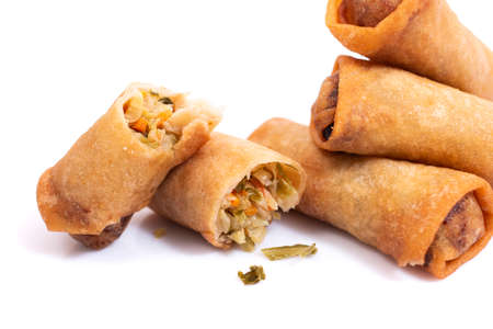 Traditional fried chinese crispy vegetable rolls isolated on a white background.