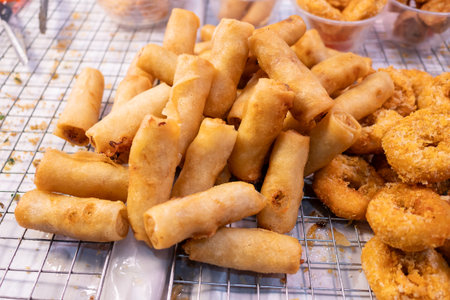 Explore the vibrant street market showcasing mouthwatering spring rolls capturing culinary culture.