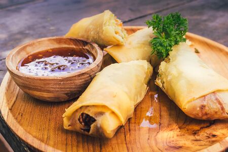 Asian deep fried spring roll filling with tofu, cabbage, carrot and glass noodle on natural plate eating with dipping sauce. Vegan food