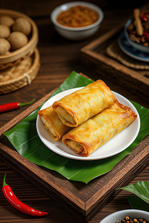 fried spring roll rice paper vegetables shrimp quick snack asia thailand malaysia full plate close-up