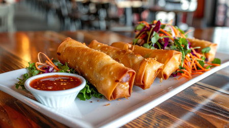 Crispy Thai spring rolls served on plate with side of sweet chili sauce and fresh salad. Perfectly fried appetizer. Concept of Asian cuisine, starters, flavorful snacks, Thai meals, dining experience