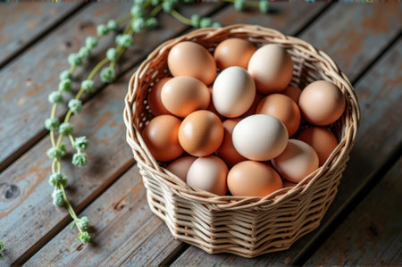 Basket of fresh brown and white eggs on rustic wooden table. That the image is generated using AI.
