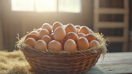 A rustic wicker basket filled with fresh brown eggs rests on a wooden surface, bathed in the warm, golden light of the morning sun streaming through a window. This image evokes a sense of wholesome country living, farm-to-table freshness, and the simple joys of a new day.