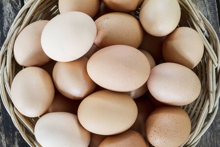 Close up of eggs in a basket. top view of eggs in bowl. Brown eggs in wooden bowl.