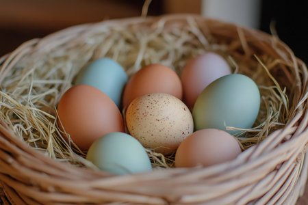 A beautiful arrangement of assorted fresh eggs in a woven basket on a light background, perfect for culinary or seasonal themes.
