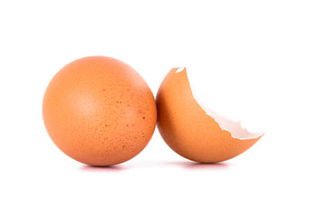broken eggs with a cracked shell, part of a cracked brown bird's egg isolated on a white background.