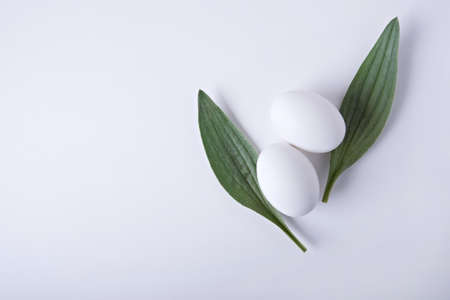 Minimalistic Easter composition. Two eggs and two leaves similar to rabbit ears on a white background.