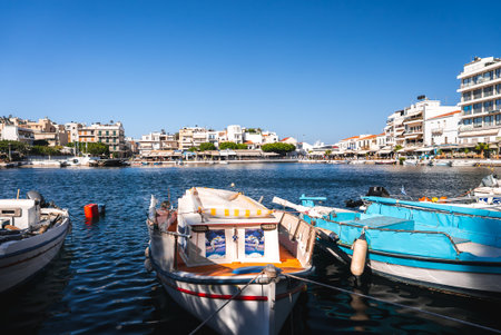 Agios Nikolaos, Greece, Crete - 05/23/2015: Ships and fishing boats in the harbor of Agios Nikolaos.