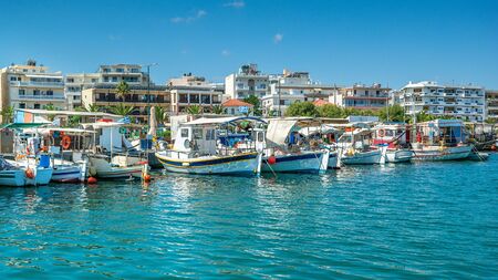 Heraklion Crete, Greece, September 14, 2017: Wide angle view of port harbor boats and cruises docked against houses in a blue mediterranean sea.