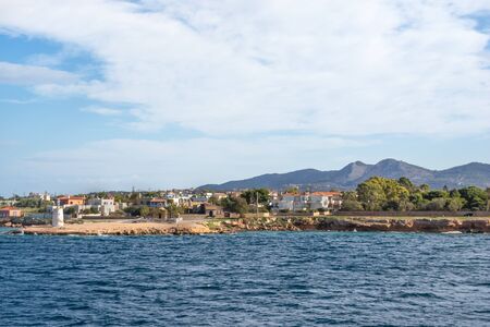 Panoramic view to the small village of Perdika, a hub for sailors and tourists, on the island of Aegina, Saronic Gulf, Greece