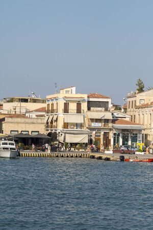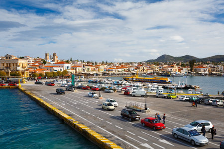 View of Aegina town and its harbour vith the moder quay for large ships where people are waiting for boarding a ferry, Greece
